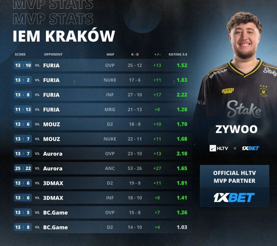 ZywOo在波兰赛事打出了1.59 rating,比他之前在EPL S19的巅峰高出0.00015,使得IEM克拉科夫成为他职业生涯中rating最高的大型赛事。