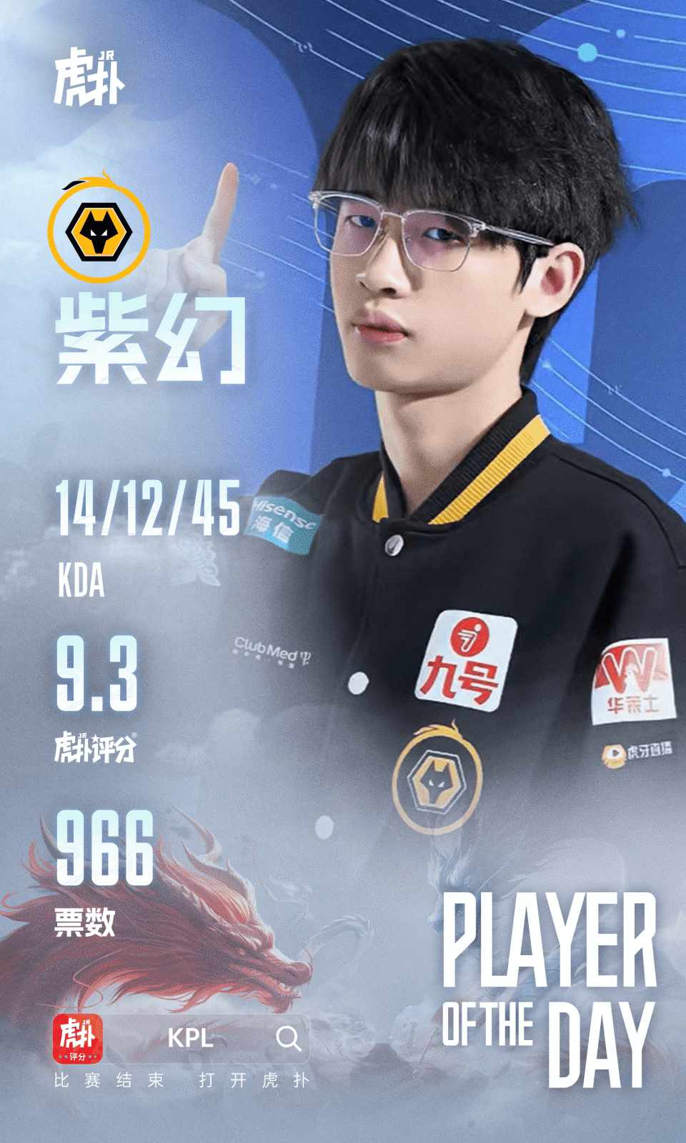 最终紫幻选手总票数966斩获昨日最佳!并且第五局海月超1.2万人打出10.0分,是春季赛第一个小局满分选手