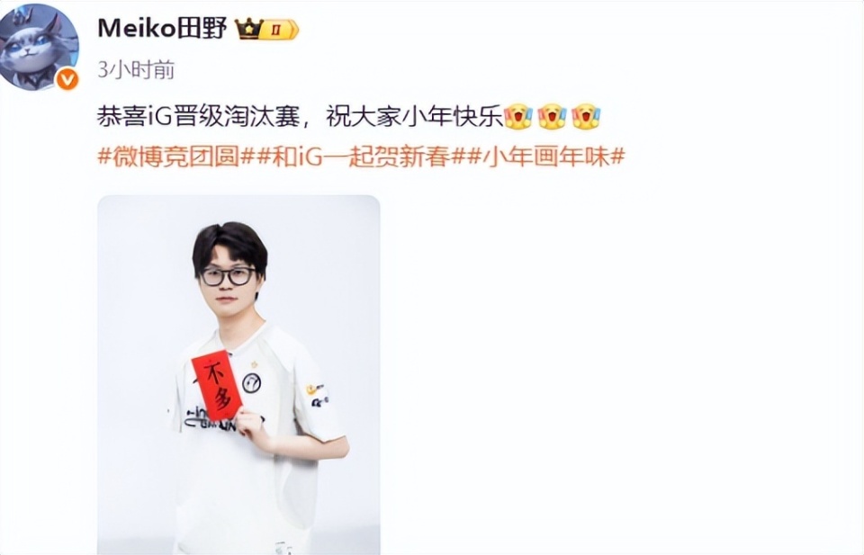 IG获胜之后,田野也第一时间送上了祝福,还别说,田野也很紧张,毕竟之前说准备好回归了,要是IG被淘汰了,怎么回归呢?