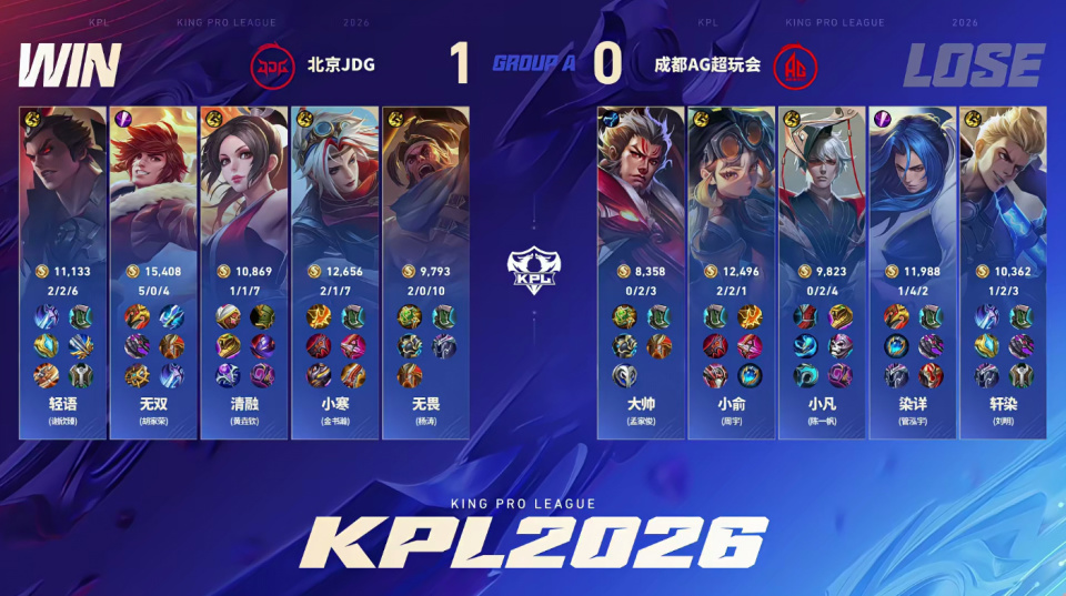 王又见王,辅助位最黑的蛋对上最帅的畏,两边的境遇已经不可同日而语,最终还是无畏更胜一筹,带领JDG3-2战胜AG,而且这是JDG队史首次战胜 AG,也是创造历史了。染详对位被无双爆了,钟意在台下是摇旗敲鼓样样行,但输了比赛意难平,还是抓紧回来训练吧。