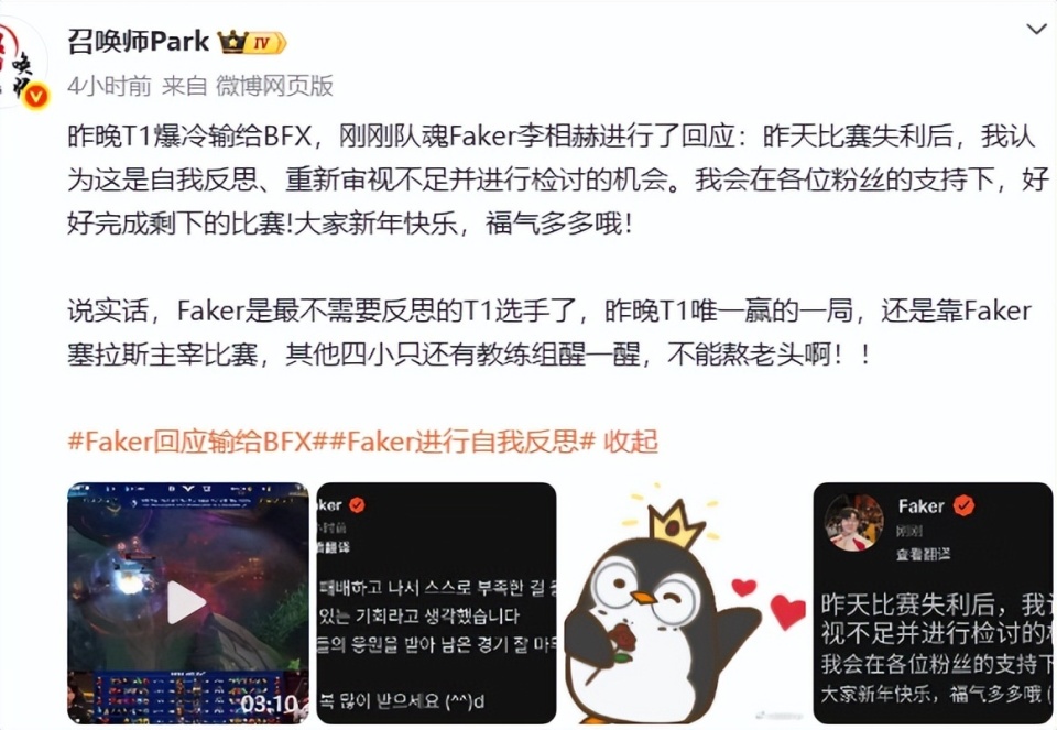 输了比赛之后,舆论也一直不停,值得一提的是,赛后Faker还主动反省了,表示,我认为这是自我反思,重新审视不足并进行检讨的机会,我会好好完成剩下来的比赛。