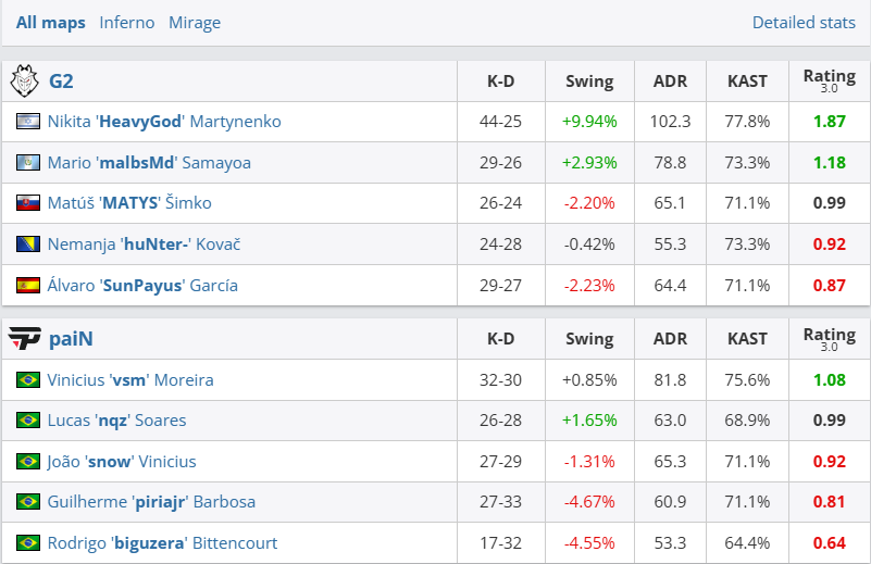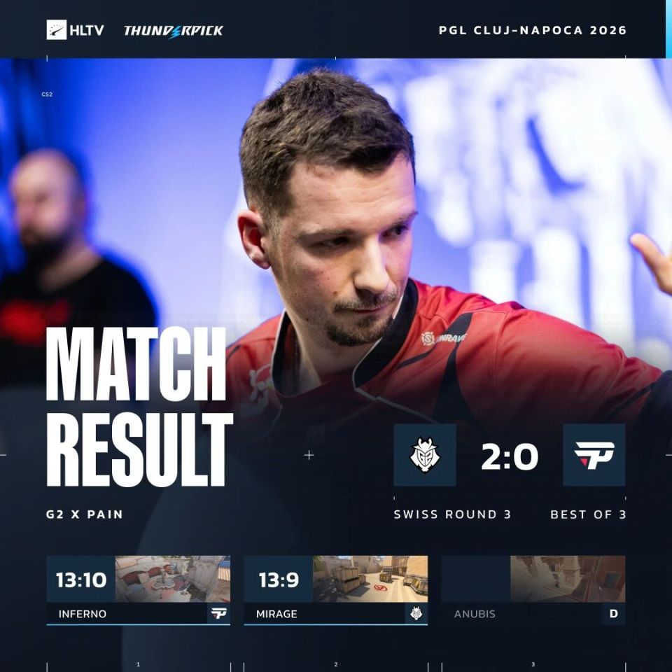 图一Inferno上两队一度打成8平,但在重神单图27杀的统治级发挥下,G2一波5-2攻势先下一城。图二Mirage的场面如出一辙,G2也是上半场取得8-4的巨大优势,即便换边被接连追分也能及时调整,最终两图淘汰paiN,保留晋级机会。