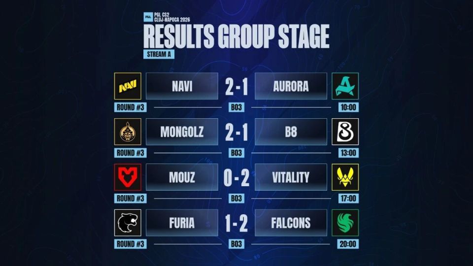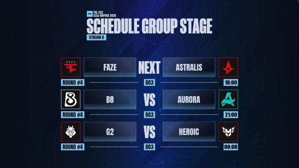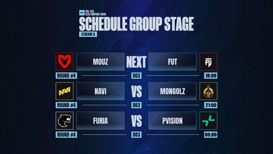 今天18:00起将继续第4日争夺,推荐MOUZ vs FUT(极致枪法)或FaZe vs A队(熟脸),MGLZ vs NAVI,FURIA vs PV这四场,欢迎届时收看。