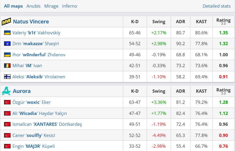 图一Anubis上半场NAVI虽落后两分,但换边赢下手枪局后连下7局,土耳其老将MAJ3R单图仅4杀,NAVI成功完成逆转。图二Mirage土耳其队构筑起钢铁防线,大B哥独木难支,Aurora还以颜色。决胜图Inferno两队战至白热化,NAVI在12-7先拿赛点下被Aurora连追5分进入加时。加时赛makazze、b1t发力,NAVI连下4局终结比赛。