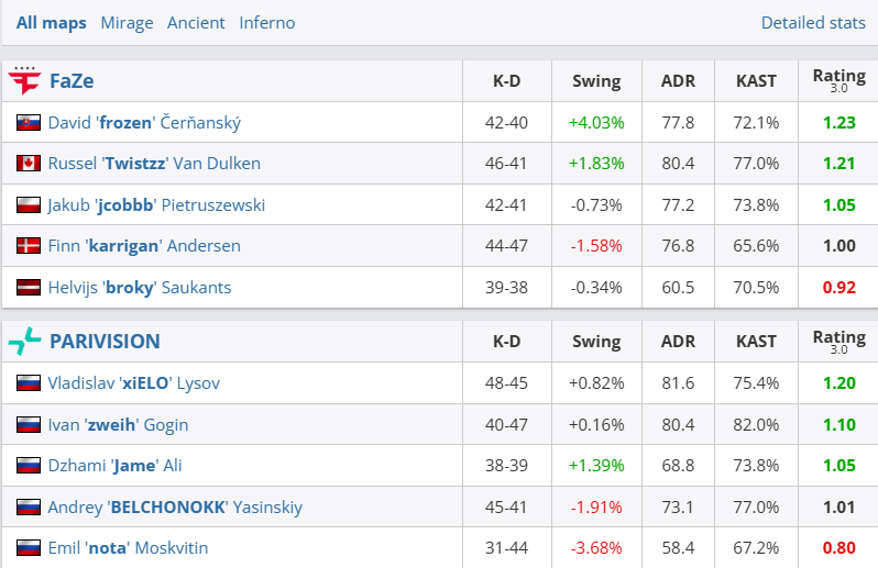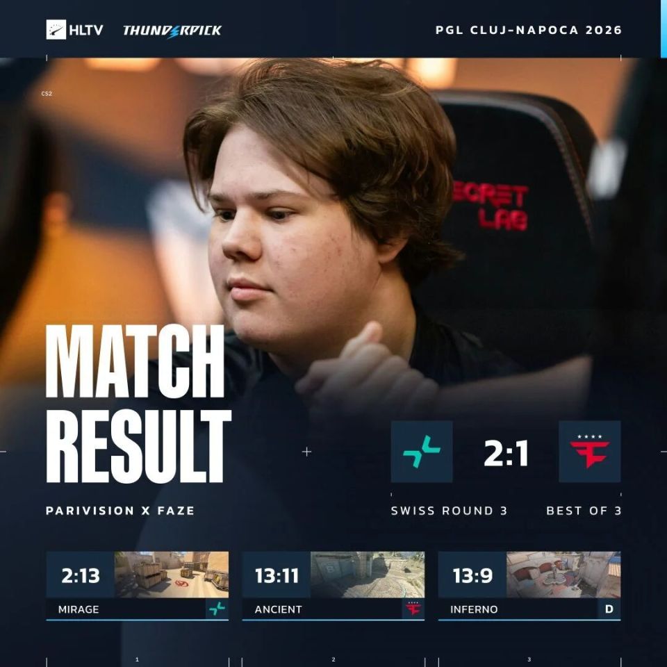 图一Mirage小将当家,jcobbb一夫当关,FaZe从指挥到选手状态完全碾压对手,PV仅拿2分。来到图二Ancient,总监又以雷霆之势率队杀穿PV防线,进攻9分在手。然而下半场画风骤变,BELCHONOKK和zweih双核爆发,PV打出一波10-2进攻潮扳回一城。决胜图Inferno上半场双方仍不分伯仲,但换边后BELCHONOKK和xiELO领衔PV进攻势如破竹,FaZe惨遭图一乐。