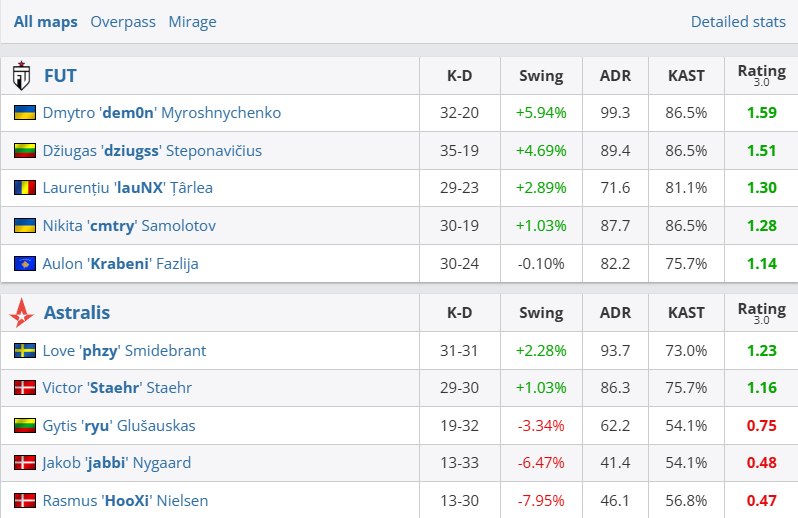 图一Overpass,丢掉手枪局的FUT立即实现翻盘,并在dziugss爆炸般表现下率队打出一波12-2狂潮拿到赛点。phzy奋力连追4分也无济于事。图二Mirage上FUT攻势汹涌,在0-2开局后全员在线打出一波13-2狂潮轻松终结比赛。