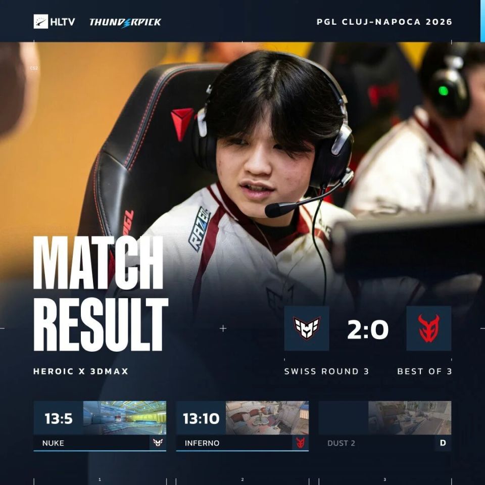 图一Dust2,0-3开局的大黄蜂随后自长枪局起接管比赛,薯薯无人能挡,Vitality打出一波13-2狂潮碾压拿下图一。图二Inferno也是同样的剧情,薯薯依然无解,车主也状态火热,MOUZ追至8分无力再抵抗,大黄蜂以全胜战绩晋级淘汰赛。