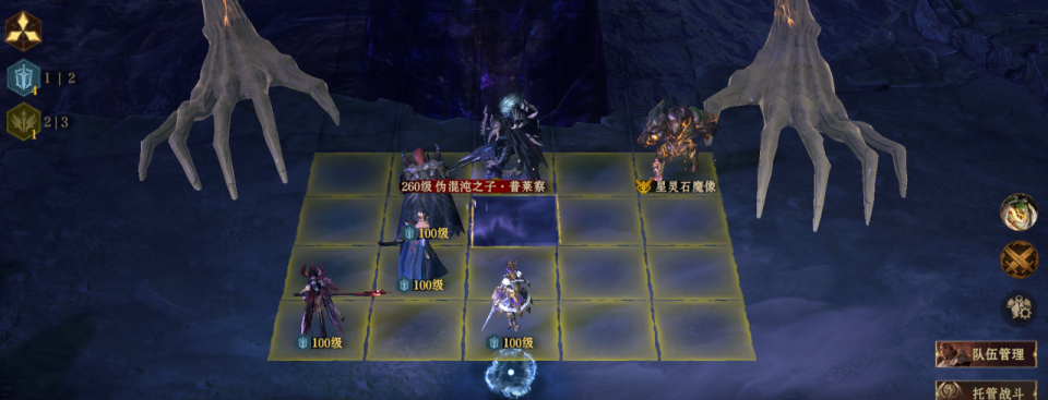 说明:魔宠推荐石魔像,如图站位令纳斯婕卡享受漩流破锋的增伤效果,没有伊姆什的旅者可替换为欧勾克,同样能独自保障队伍长时间的存活。