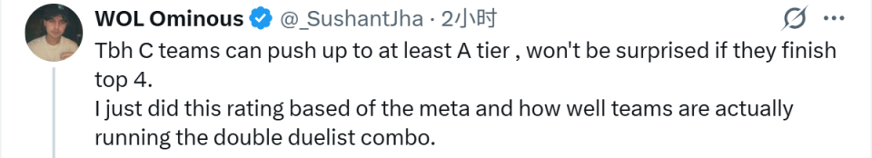 有网友不解为何把PRX放在C级,Ominous则回复道:"说实话,C级队伍至少可以到A级,就是如果他们最终打进前四的话我也不会感到惊讶。我只是根据当前版本以及各队实际使用双决斗的情况来进行评级的。"