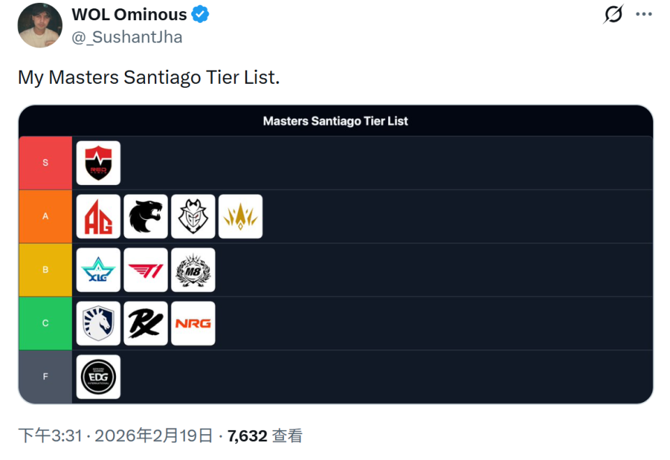 虎扑02月19日讯 WOL分析师Ominous的大师赛战队评级: