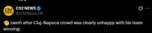 虎扑02月20日讯 在今晚结束的PGL克卢日纳波卡1/4决赛的比赛中,PV以2-1淘汰Falcons晋级半决赛。而在PV获胜后现场观众爆发巨大嘘声。赛后Zweih更新TG频道暗指对现场观众这一行为的不满
