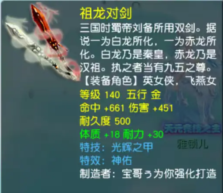 畅玩服大闹天宫服务器又出神兵利器啦!一把140级双短剑横空出世,属性简直美如画——伤害高达451,命中661,还附带体耐双加48点!更绝的是,这把武器不仅带着实用特技“光辉之甲”,还拥有让人心安的“神佑”特效。然而当大家看到制造者ID时,全都笑喷了——“宝哥”两个大字赫然在目!想想宝哥自己鉴定了几千件装备都未曾摸到这样的辅助神器,这回怕是看得眼珠子都要掉出来了吧?