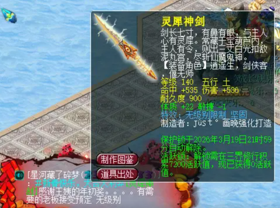 就在大家忙着走亲戚的时候,这位老板闷声发大财,一手鉴宝直接炸出一把140级无级别宝剑!伤害536,命中535,体质+22,虽然减了1点敏捷,但这点小瑕疵在无级别特效面前根本不叫事儿!