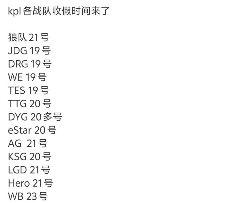 过不了几天KPL春季赛就要开打了,近期有瓜主透露十三队收假情况,JDG 、DRG、WE、TES都是19号,TTG、DYG、eStar、KSG都是20号,AG、狼队、LGD、Hero都是21号、WB23号收假荣获年假最长战队,这就是挑杯冠军的底气。