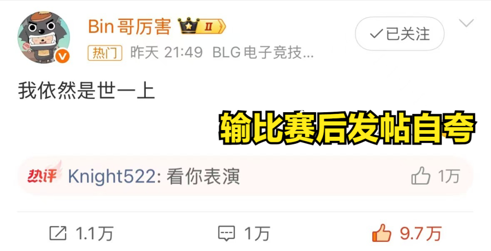 其实我个人觉得Bin哥输比赛还发帖不太合适,因为作为我们LPL赛区明星选手,Bin哥的一言一行都代表着赛区的脸面,这次的发言可以说是让其他赛区看我们笑话了。正常情况下输了比赛就应该认真反思不足,从而去改进,而不是第一时间发帖还自称是“世一上”,Bin哥多少有点不太尊重比赛了。