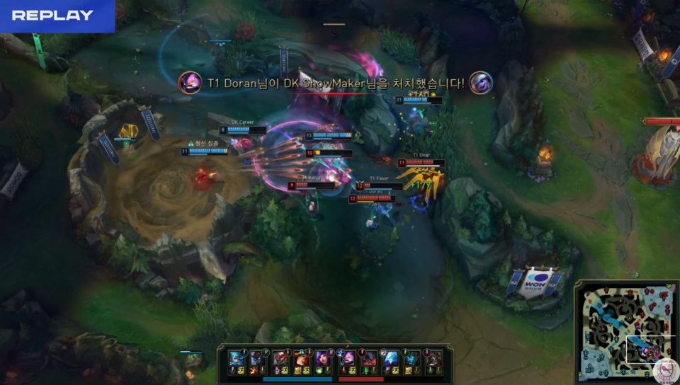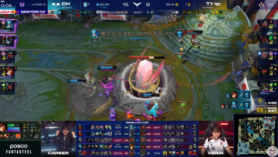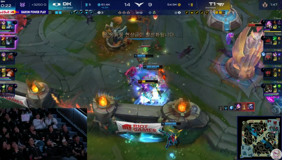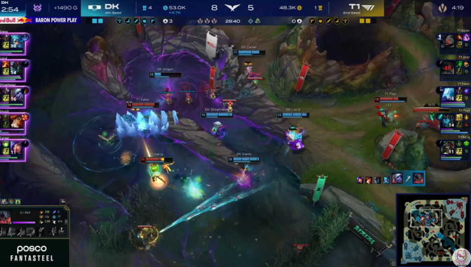 DK利用击杀凯南的机会,直接秒掉了大龙。T1强行来接团,结果被DK近乎团灭,甚至复活赶过来的Doran凯南又送给了Showmaker小炮一个击杀。至此,DK前期劣势的中单也被盘活了。
