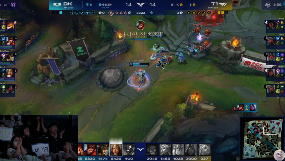 T1原本在第四局是可以结束这场Bo5的,他们的优势很大,打野Oner的亚恒前期5-0。但是没有控下小龙,以及打团时被蛇女牵制,还有最重要的是让Doran玩了一个不熟练的塞拉斯,最终导致他们被DK实现了让二追二。