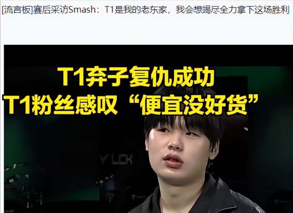 T1在转会期放弃AD选手小吕布的时候,很多观众都认为,T1替补选手Smash将要上位成功,但是令很多T1粉丝无语的事情发生,那就是T1管理层为了“省钱”直接签约了pezy,最终导致Smash被T1管理层抛弃,很多Smash都希望未来Smash能否复仇T1。而Smash本人也是在赛前公开放狠话,表示要拼尽全力淘汰T1,而在这场BO5当中Smash也是成功证明自身实力。