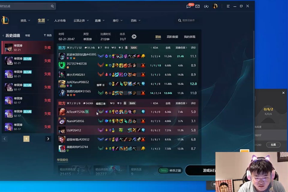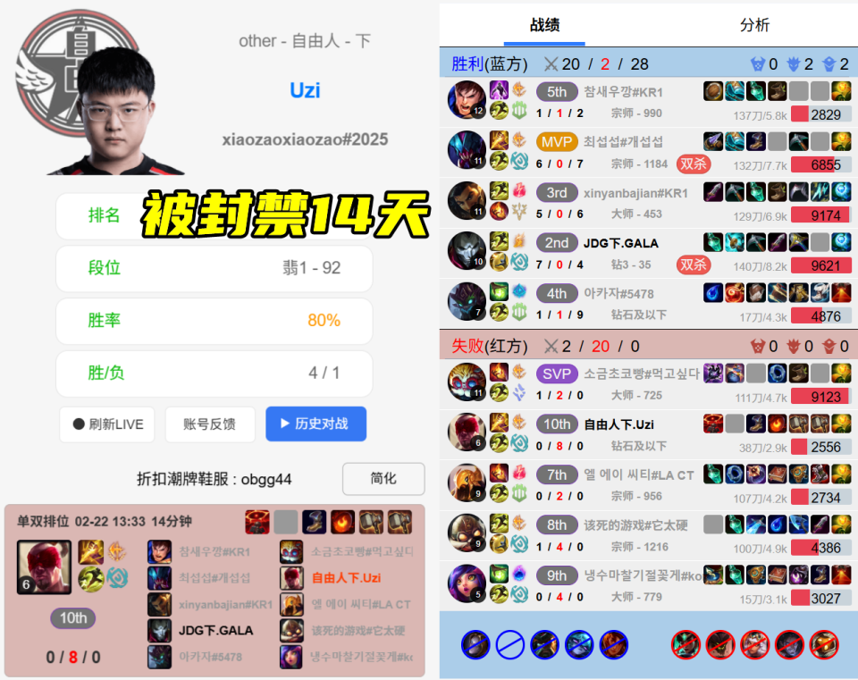 这种情况小花生之前也遇到过,他在打韩服时用蔚打了个0-14-0,这个战绩一打完也被检测封号了。不过韩服毕竟是他们的主舞台,在连打几个电话之后,账号也是被救了回来。不难看出,韩服的惩罚力度还是很严格的,乌兹对此也是吐槽:韩服封号太效率了,打完一把080就被封14天,也不看我们辅助掉线的,我那么C的时候,那系统怎么不鼓励鼓励我,我一把080就被奖励14天。没办法,乌兹又只能回归国服,但国服这边却又迎来了10连跪。