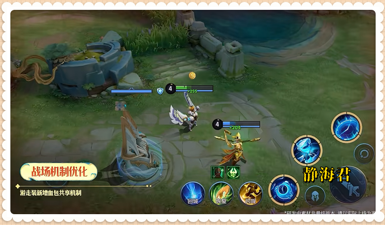 一是,针对游走英雄新增了血包共享机制(辅助吃血包后,附近的英雄也能恢复同样的水量)。