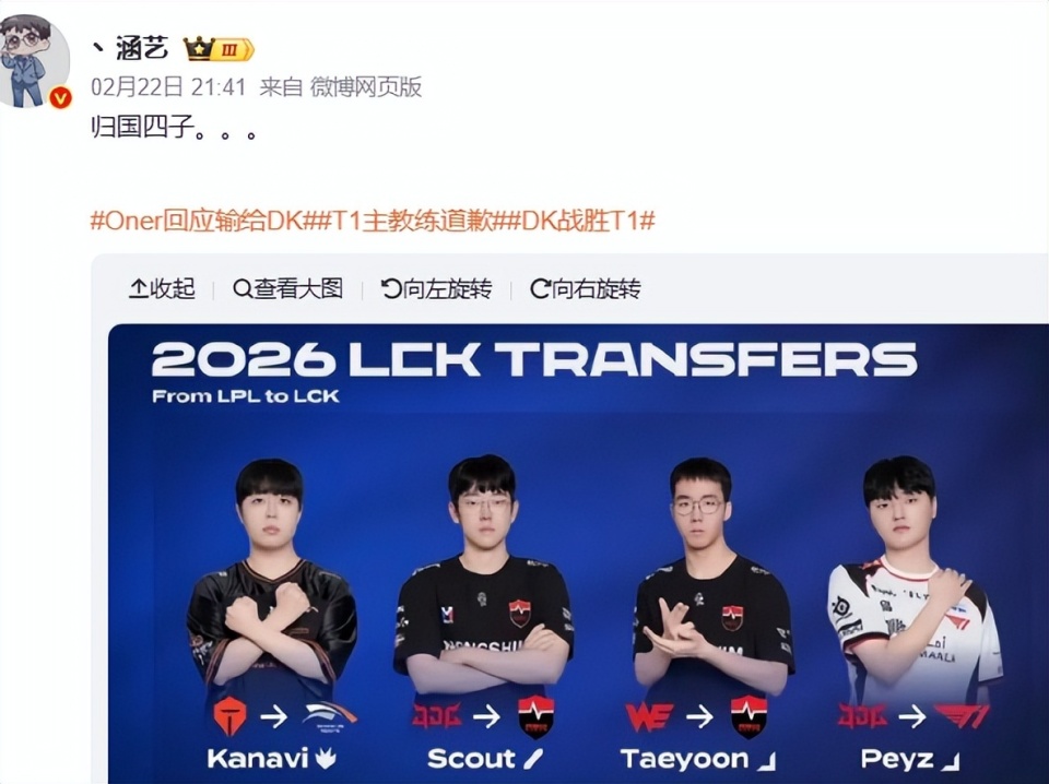 说起来也是有意思,LPL粉丝们是会造梗的,之前娱乐圈不是有个归国四子吗,这次网友们总结了一波之后,发现LCK也来了一波归国四子,太秀了。关注的网友们都清楚,这四个人分别是Kanavi、Scout、Taeyoon和Peyz。你还别说,刚好四个名额,还全部都是同一时间从LPL返回LCK了,太秀了。当然,不同于娱乐圈归国四子的风光,电竞圈的归国四子就太难受了,目前为止,随着T1的落败,全部都无缘先锋赛。