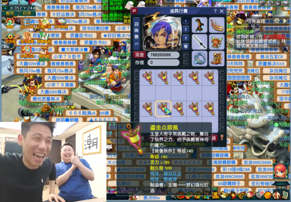 昨晚,旭旭宝宝帮助梦幻西游的两位好友“路大叔”与“毕总”鉴定了一大批140级装备。起初,“路大叔”先行开路,结果却基本拉胯。然而风水轮流转,轮到“毕总”时,好运突然降临,旭旭宝宝不仅炸出了“法系的梦想”这一稀有成就,更鉴定出了一件拥有X9顶端蓝字的无级别限制神装。接下来,就带大家一睹其真容。
