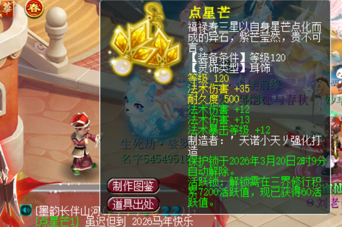 不久前,【雨花台】有位玩家在鉴定120级灵饰时,竟炸出一对极品耳饰——基础属性法伤,下排附加双法伤一法暴!虽下排属性接近国标,但上排法伤仅差1点即可达到极限,堪称129竞速大佬的梦中情饰。佩戴后能有效提升任务效率,助力刷新更多速刷纪录。