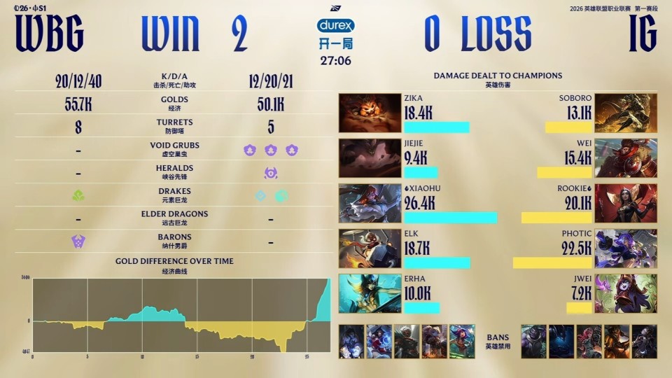 第一局iG选出上单维鲁斯,第21分钟砍下四杀。局势有来有回的情况下,第43分钟,WBG开大龙,iG决策完全昏头,WBG先下一局。