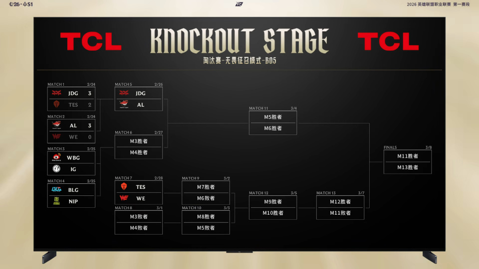 经过冗长的小组赛和卡位赛之后,8支战队进入了淘汰赛:JDG,TES,AL,WE,WBG,IG,BLG和NIP。他们要经过淘汰赛之后,决出第一赛段的冠军。特别提示一下,第一赛段的冠军有80点的积分哦。
