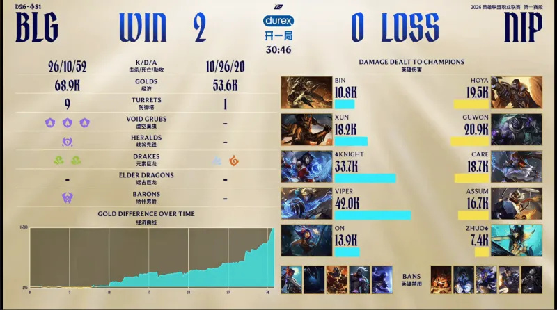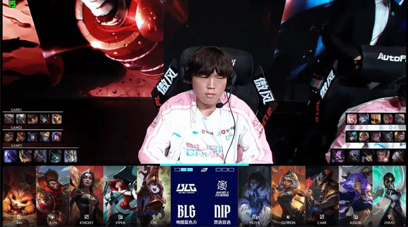 第一局比赛,BLG蓝色方,禁用:芸阿娜;韦鲁斯;鳄鱼;泰坦;卢锡安,选用:Bin狼母;Xun潘森;Knight炸弹人;Viper烬;ON巴德;NIP红色方,禁用:发条;兰博;妮蔻;伊泽瑞尔;卡莉斯塔,选用:HOYA波比;Guwon蔚;Care沙皇;Assum寒冰;Zhuo萨勒芬妮