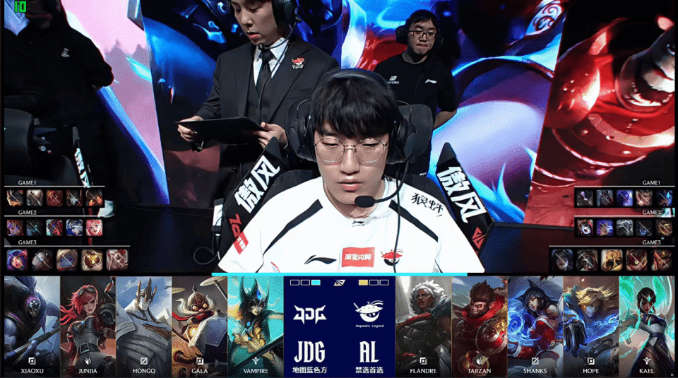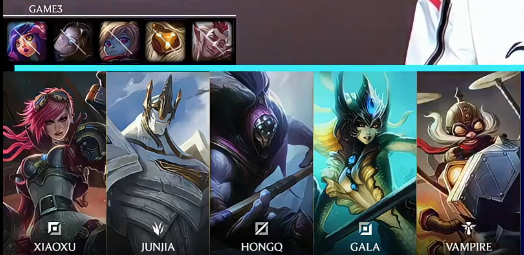 JDG选用:Xiaoxu贾克斯;JunJia蔚;HongQ加里奥;GALA飞机;Vampire娜美
