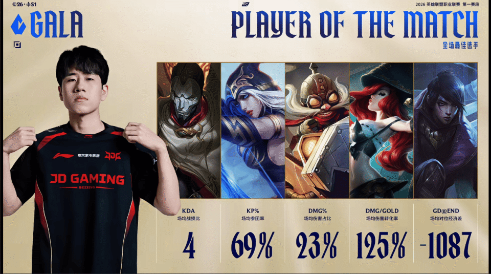 虎扑02月26日讯 在今天的JDG对阵AL的BO5比赛中,GALA稳定发挥伤害打满,斩获JDG对阵AL大场MVP