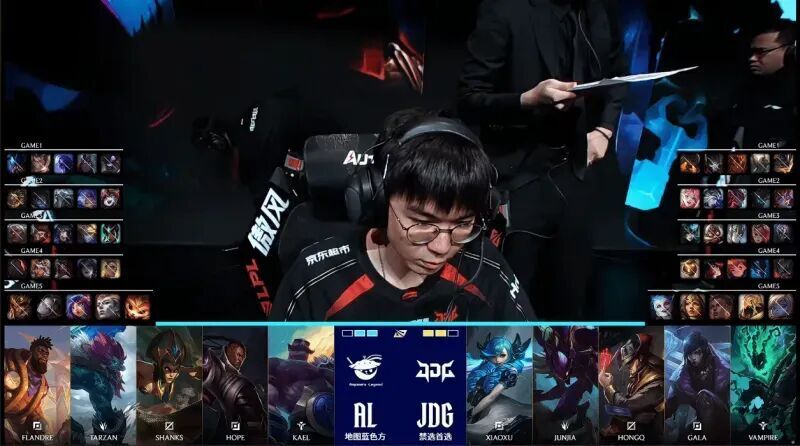 第一局比赛,AL蓝色方,禁用:妮蔻;发条;蔚;芸阿娜;希维尔,选用:Flandre雷克赛;Tarzan赵信;Shanks瑞兹;Hope韦鲁斯;Kael牛头;JDG红色方,禁用:波比;沙皇;皇子;巴德;狼母,选用:Xiaoxu兰博;JunJia潘森;HongQ岩雀;GALA烬;Vampire泰坦