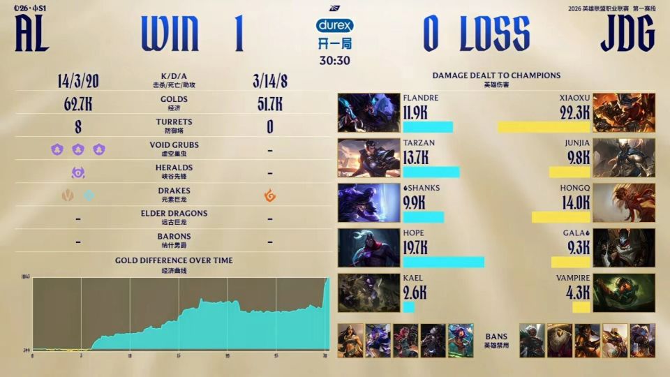结果第一局比赛,被AL打成了单方面的碾压局。5分钟,Tarzan抢下河蟹并单杀JunJia,AL上路团战大获全胜完成0换3;7分钟,Vampire泰坦先手出勾,Kael完美Q闪配合Hope完成线杀;17分钟,Flandre抓住机会切死HongQ,AL一波乱战完成1换2;20分钟,Tarzan上头冲锋开启团战,JDG众人及时反打完成0换2;最终30分30秒,AL团灭JDG,先赢一局!
