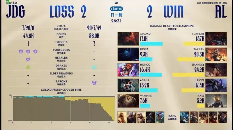 按照赛程安排,2月26日的比赛,由JDG对阵AL组成。他们谁能赢下比赛,让我们一起来看一下吧!