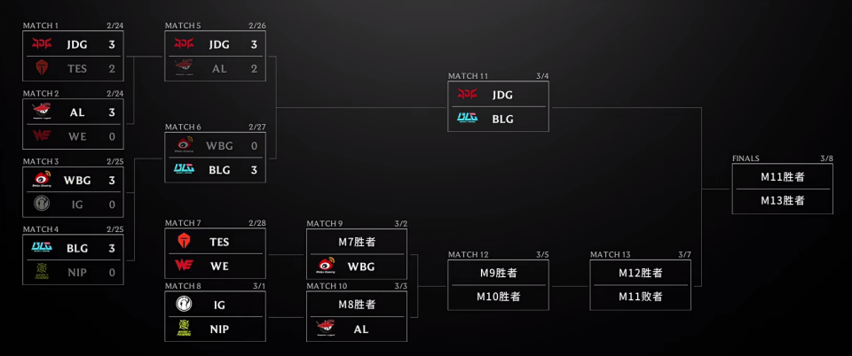 在LPL采用双败赛制以来,BLG成为进入胜决次数最多的队伍,一共6次!这已经是胜者组的比赛,小组第二打小组第三,按理说双方实力差距不应该这么大。但BLG每局都在对线就打爆了WBG,不费吹灰之力就获胜。二路直播的Uzi都感叹:“BLG有点太残忍了,WBG完全没得打啊,有点像主播在鱼塘局一样。”不过现在还不能说BLG游龙,可能今天只是因为对手WBG不在状态。而且就算BLG拿LPL优胜者都是应该的,他们必须在国际赛场拿冠军才算成功。小组赛Viper表现一般,而且巧的是,Viper大多数对局输出都稳定在17K~18K,很多人就黑Viper不打伤害。而恰好Elk又经常爆C,就有一种Viper买错了的感觉。但是今天,双方差距最大的就是下路,Viper也斩获了全场最佳选手,场均伤害占比29%。Viper绝非水货,找回状态就是顶级。就连赛后采访Elk也坦言:“我觉得他们下路打得更好,好很多吧。”JDG与BLG进入胜者组决赛,胜者再进入决赛,并获得第一张参加全球先锋赛的门票(一共两张)。不过这场比赛要好几天之后的3月4号了。小组赛JDG在整体战绩一般的情况下,却“双杀”了BLG,堪称“BLG克星”。看是BLG复仇成功,还是JDG继续当黑马。接下来几天都是败者组的比赛,没有复活甲了,输了就会被淘汰,要把队伍的龙纹晶石镶嵌在奖杯底座上。明天17:00 TES vs WE,两支队伍要加油哦。