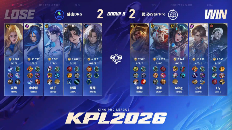 第一局eStar斗志昂扬的样子。在DRG红区,狂铁和大司命碰面,配合阿古朵打残了大司命,大司命开大坐到零个人,fly一闪拿下小小阳的一血。苏烈的位置也比较尴尬,没有队友能接应,eStar打出零换二。阿古朵体系拿到优势一路平推,一路平推,竟然打得DRG没有还手之力,12分钟出头就轻松拿下了。