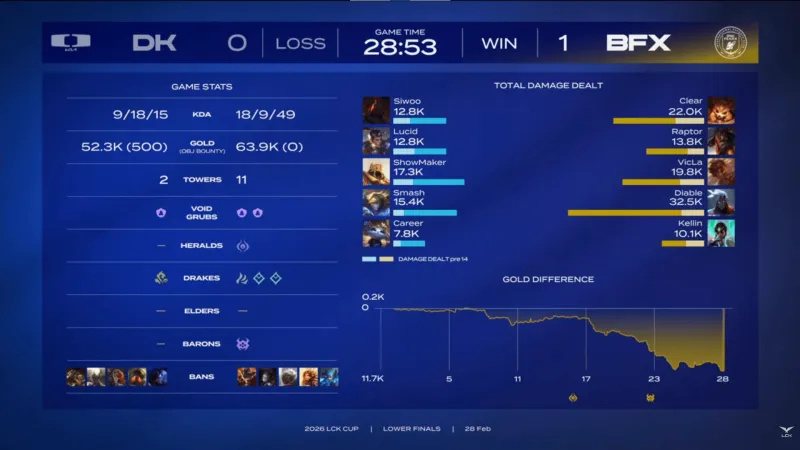 第一局比赛,DK蓝色方,禁用:鳄鱼、潘森、蔚、泰坦、雷克塞,选用:Siwoo塞恩、Lucid赵信、ShowMaker沙皇、Smash伊泽瑞尔、Career悠米;BFX红色方,禁用:兰博、发条、安蓓萨、蕾欧娜、格温,选用:Clear纳尔、Raptor皇子、VicLa岩雀、Diable韦鲁斯、Kellin卡尔玛