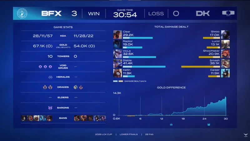 第二局比赛,BFX蓝色方,禁用:安蓓萨、波比、蔚、蛇女、奥拉夫,选用:Clear鳄鱼、Raptor巨魔、VicLa瑞兹、Diable艾希、Kellin萨勒芬妮;DK红色方,禁用:发条、潘森、兰博、蒙多、盲僧,选用:Siwoo阿萝拉、Lucid猴子、ShowMaker永恩、Smash炸弹人、Career泰坦