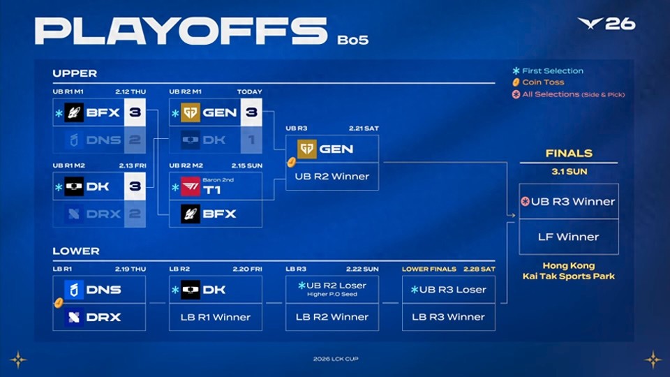 经过春节假期的休整期之后,LCK 2026春季赛终于在2月21日,重燃战火。BFX,GEN,DNS,DRX,DK和T1,将向第一阶段冠军发起挑战。