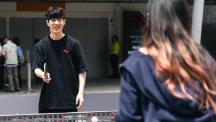 知名电竞选手TheShy现身新加坡大满贯公园体验品趣味乒乓球项目,与新加坡队选手舒麟茜打乒乓球。