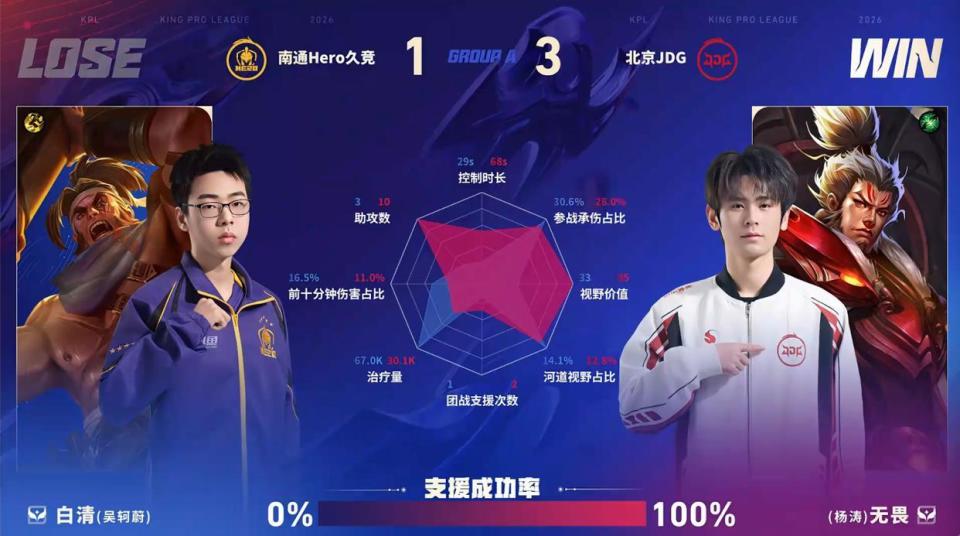 同样令人捉摸不透的,还有北京JDG这支队伍,在2月28日对战南通Hero的比赛中,JDG以3:1的大比分优势战胜对手,凭借五连胜的成绩稳坐A组榜首之位。