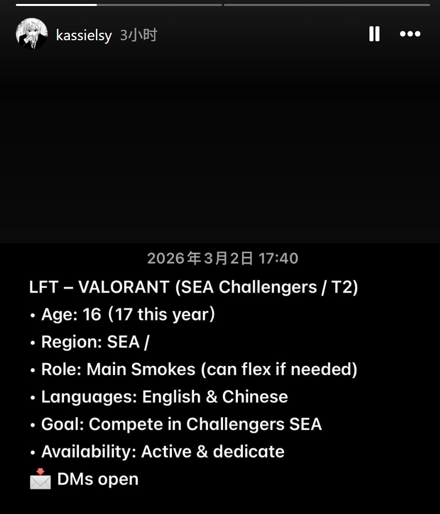 虎扑03月02日讯 BLG青训选手kassielsy发文寻找东南亚次级队伍: