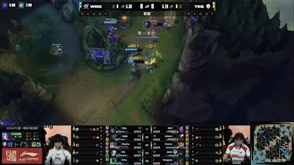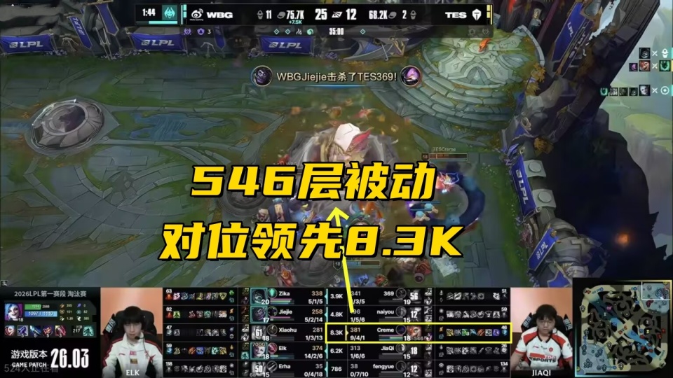 WBG在决胜局的时候,直接押宝ELK,上中野辅四保一金克斯,选出这套阵容的时候,观众其实都为微博捏了一把汗,因为现在的版本,虽然是以下路为核心,但一旦下路前期崩了,比赛基本上就结束了,微博四个肉的前排阵容,在金克斯没有成形之前,是没有很高的伤害的,只能拖。