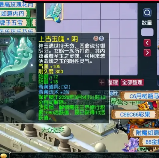 昨晚,一名玩家在跑魂铸任务的过程中,意外逆袭了一枚顶尖阴玉魄。单就属性来看,这枚玉不仅具备双防御一气血的极品基础属性,还附带了3%奇袭法术的完美词条。它可以提供高额的抗性,同时提升二次出手的几率,适配任何主流PK门派,堪称服战大佬的首选玉魄。