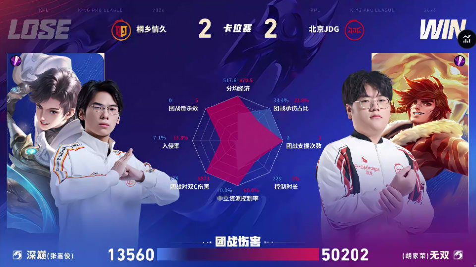 虎扑03月04日讯 情久/JDG第四局数据对比:无双裴擒虎团战伤害高达五万
