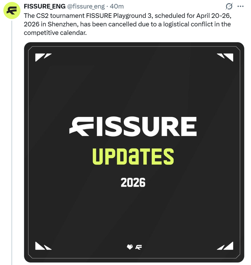 赛事运营方FISSURE宣布取消FISSURE裂变天地3赛事,该消息已通过其官方X账号发布公告。