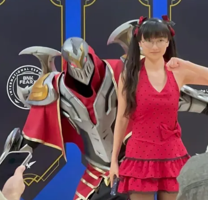 当天来到现场观赛的还有解说管泽元、主持人余霜以及选手YSKM,但不得不说,镜头和讨论热度却被这位“女版Faker”牢牢吸住,她与现场coser互动、合影留念,一举一动都在强化那种“真假难辨”的趣味感。