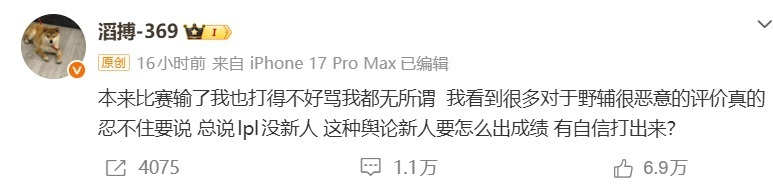 正当观众们讨论这个事情的时候,让人意想不到的事情发生了,TES上单369竟然下场发微博了,开始力挺自己的队友,直言对于观众们针对野辅的恶意评价实在看不下去了,总说LPL没有新人,这种舆论要新人怎么出成绩。