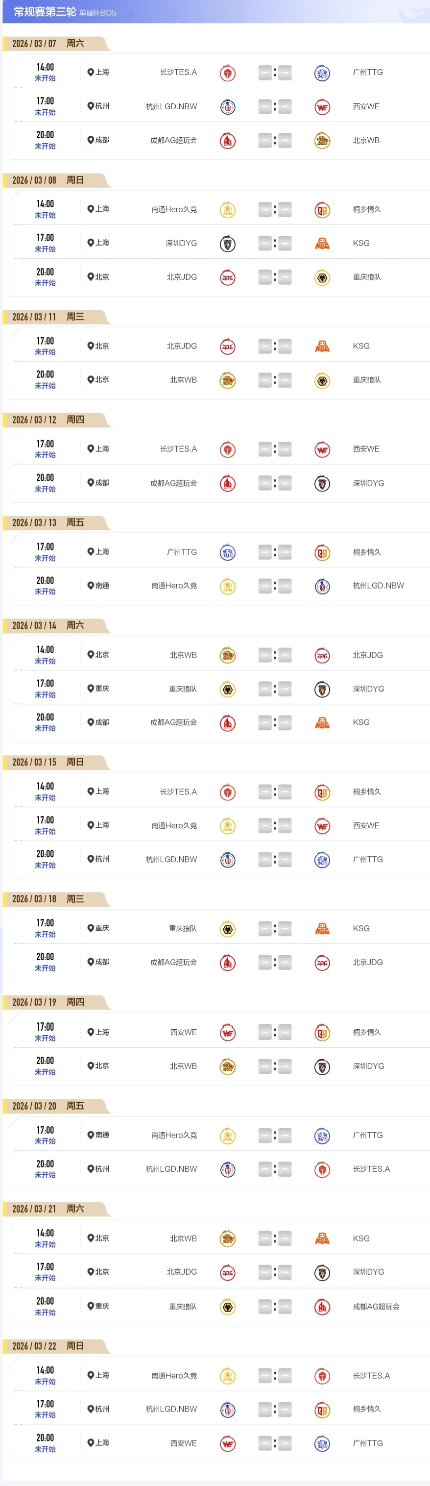 常规赛第三轮赛程:3月11日狼队对阵WB,3月21日红狼大战
